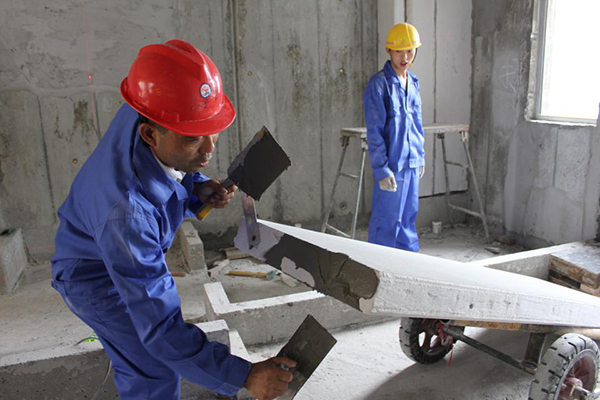 2、根據(jù)排版圖進(jìn)行墻板的拼縫,把板固定在結(jié)構(gòu)柱或地面的頂部與底部。避開門窗洞將板塊勾結(jié)鋪滿。